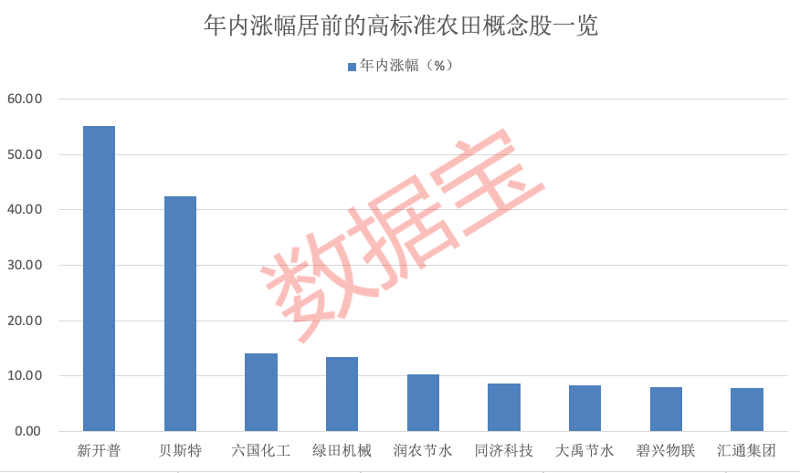 目前高标准农田概念股中,新开普、贝斯特、六国化工、绿田机械、润农节水的股价年内累计涨幅居前。