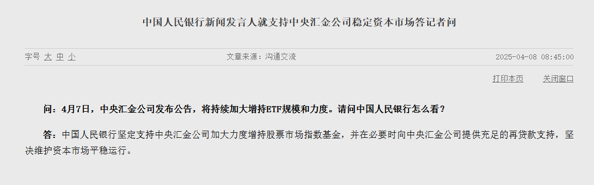 截至目前,市场高度关注政策端的供给情况,光大证券首席经济学家高瑞东称,在当前 A 股市场面临外部关税政策扰动的关键时点,汇金公司及时增持,进一步落实了决策层维护金融市场稳定的指示,充分彰显了监管层维护资本市场平稳运行、引导中长期资金入市的决心。