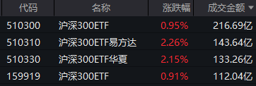沪深300ETF(510300)成交额较昨日略减,为216.69亿。但另外3只千亿级的沪深300ETF(分属易方达、华夏和嘉实三家基金公司旗下),成交额进一步放大。