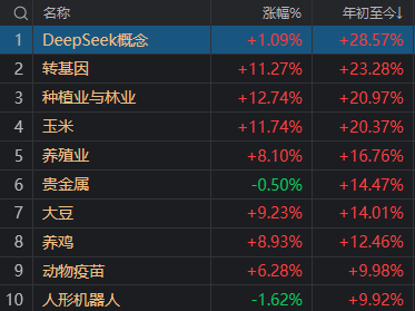 在所有板块指数中,科技线目前仅有DeepSeek概念暂居榜首,其他题材经过近期回调后,已纷纷让位于多个农业题材。
