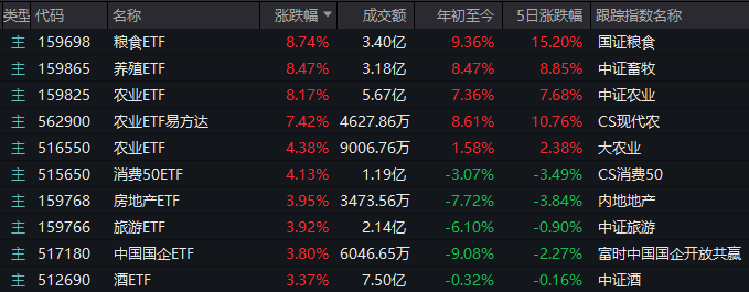 相应地,在主题型ETF中,粮食、畜牧养殖、农牧、农业等主题的产品也涨幅明显领先。