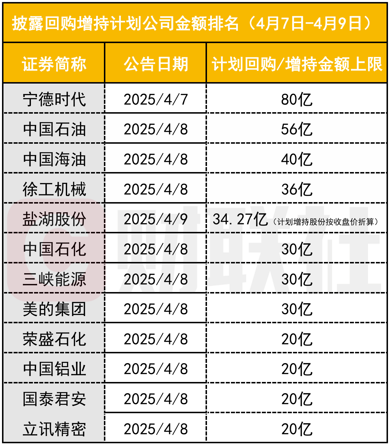 披露回购增持计划的公司按金额排名(4月7日-4月9日)