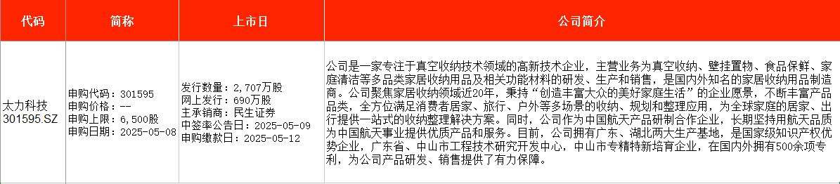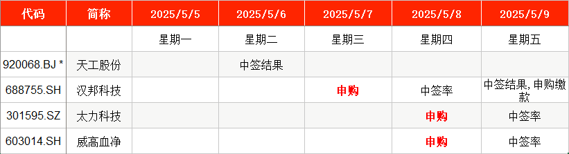 从时间表看,汉邦科技在周三(5月7日)申购,太力科技、威高血净则在周四(5月8日)申购。