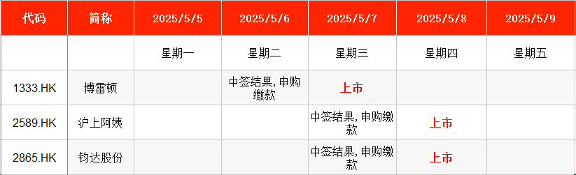 Wind数据显示,博雷顿(01333.HK)将在本周三上市,沪上阿姨(02589.HK)、钧达股份(02865.HK)将在本周四上市。