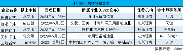 4月份,A股市场有5家公司终止IPO申请,分别为拟上市上证主板市场的云峰新材,拟上市创业板的渡远户外,以及拟上市北交所的思锐光学、博达软件和天和环保,这一数量不仅较3月份的10家大幅减少,也创下了自2023年8月27日证监会提出“阶段性收紧IPO节奏”以来的新低。