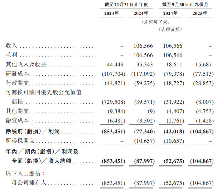 招股书显示,截至2023年及2024年12月31日止年度以及截至2025年9月30日止九个月,公司分别录得亏损净额8.54亿元、8800万元及1.05亿元,主要由于,公司的研发项目所招致的研发成本;支持公司业务营运产生的行政开支;及公司可转换可赎回优先股于相关年度/期间的公允价值变动导致的可转换可赎回优先股公允价值亏损。