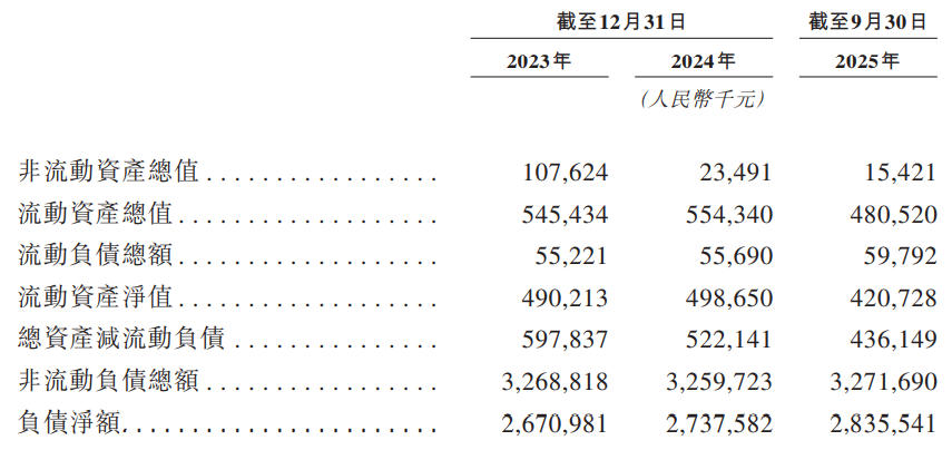负债方面,截至2023年及2024年12月31日以及截至2025年9月30日,公司分别录得负债净额26.71亿元、27.38亿元及28.36亿元。