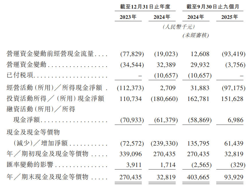 截至2023年12月31日止年度及截至2025年9月30日止九个月,公司分别录得经营活动所用现金净额1.12亿元及9720万元,主要由于公司于年/期内产生大量研发成本。