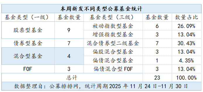 11月24日,记者从公募排排网获悉,本周(11月24日至11月30日)全市场共有23只新基金启动募集,平均认购天数为23.65天。与前一周相比,新基金发行数量环比下降32.35%,平均认购天数延长超3天,呈现“数量减少、募集期拉长”的趋势。