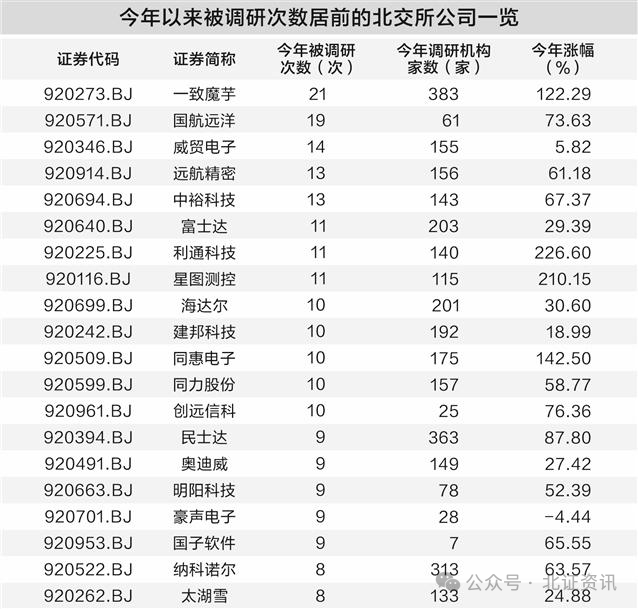 2025年,北交所市场的机构调研热情迎来大提升。截至目前,272家北交所公司接受各类机构调研,覆盖比例超95%,一致魔芋以21次的高频调研成为“明星标的”。调研主体从基金、券商,扩大到社保基金、知名私募、产业资本以及外资机构。