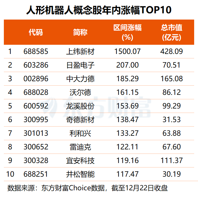 超九成人形机器人概念股年内股价上涨,获智元机器人入主的上纬新材区间涨幅居首,今年以来,公司股价累计涨幅已超15倍;三协电机、胜宏科技年内涨幅均超6倍;浙江荣泰、涛涛车业、豪恩汽电等6股区间涨幅均在2倍以上。