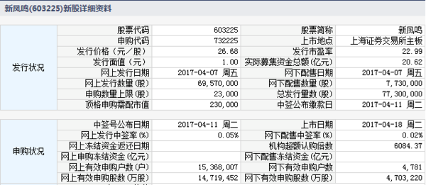 根据交易所公告,新凤鸣集团股份有限公司于2017年4月18日起在上海证券交易所主板上市。公司主营业务为民用涤纶长丝的研发、生产和销售。公司总股本为60200万股,发行价26.68元,其中上网定价公开发行的7730万股今日起上市交易。
