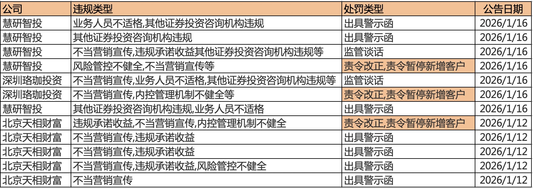 慧研智投并非孤例。今年以来,北京天相财富、深圳市珞珈投资两家机构也分别被采取暂停新增客户三至六个月不等的监管措施。