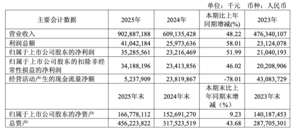 3月10日晚,工业富联(601138.SH)正式发布2025年度业绩报告。年报显示,公司2025年营收突破9000亿元,达9028.87亿元,同比增长48.22%;归母净利润352.86亿元,同比增长51.99%,利润增速高于营收增速。报告期内,基本每股收益(EPS)1.78元,同比增长52.14%;加权平均净资产收益率(ROE)21.65%,同比增长5.8个百分点,两大核心盈利指标均刷新上市以来纪录。