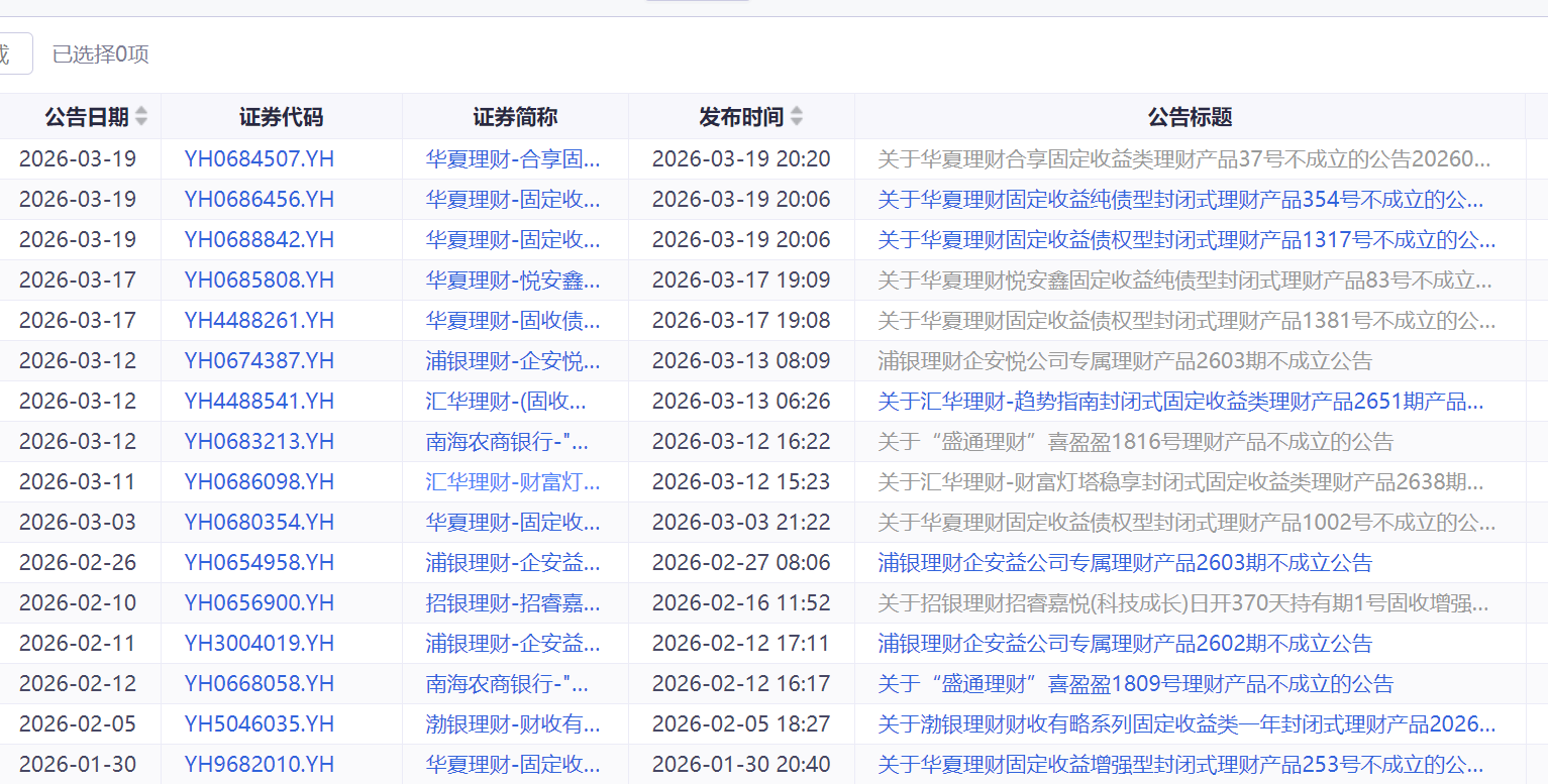 如浦银理财近日表示,公司于2026年3月4日发行浦银理财企安悦公司专属理财产品2603期,截至2026年3月10日认购期届满。因本产品认购总金额未达产品说明书的发行规模下限,产品不成立。浦银理财将在认购期结束后两个工作日内,退还所有投资者认购资金。