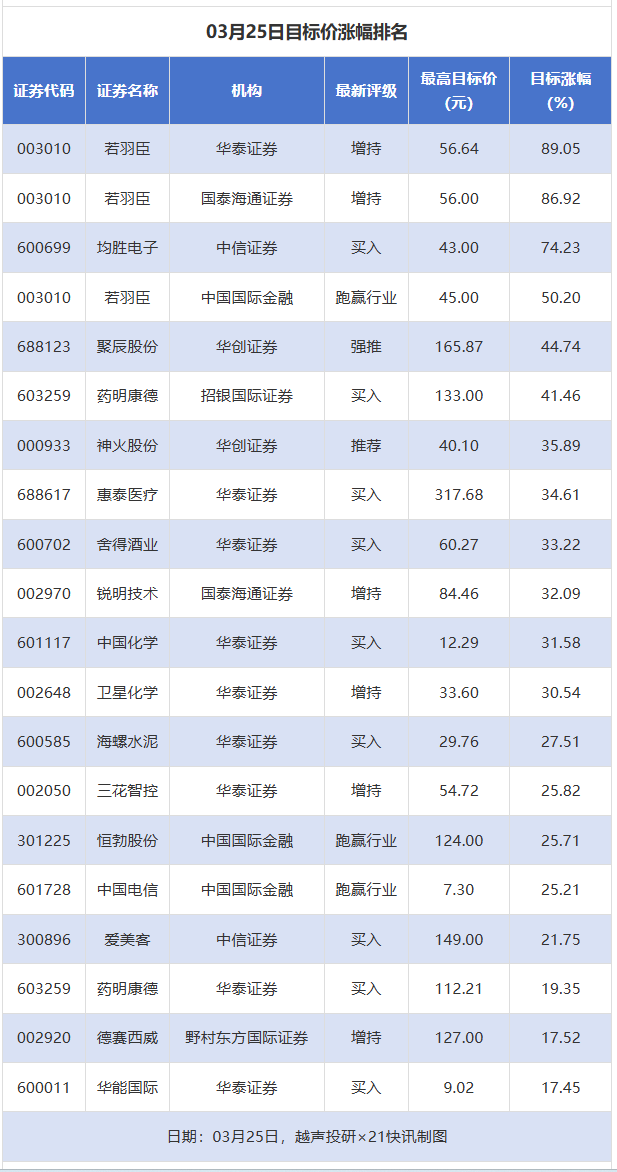 越声投研数据显示,3月25日,券商给予上市公司目标价共31次,按最新收盘价计算,目标价涨幅排名居前的公司有若羽臣、均胜电子、聚辰股份,目标价涨幅分别为89.05%、74.23%、44.74%,分别属于互联网电商、汽车零部件、半导体行业。