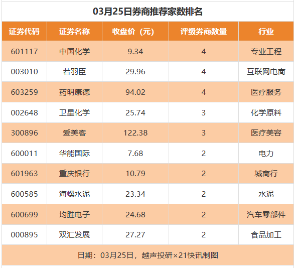 从券商推荐家数来看,3月25日有51家上市公司得到券商推荐,其中中国化学、若羽臣、药明康德均获得4家推荐。