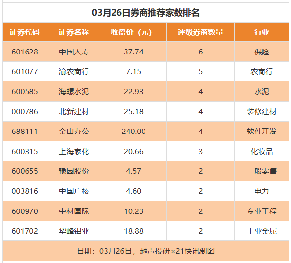 从券商推荐家数来看,3月26日有70家上市公司得到券商推荐,其中中国人寿获得6家推荐,渝农商行获得5家推荐,海螺水泥等获得4家推荐。