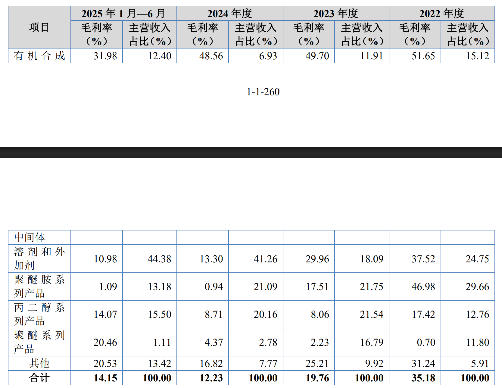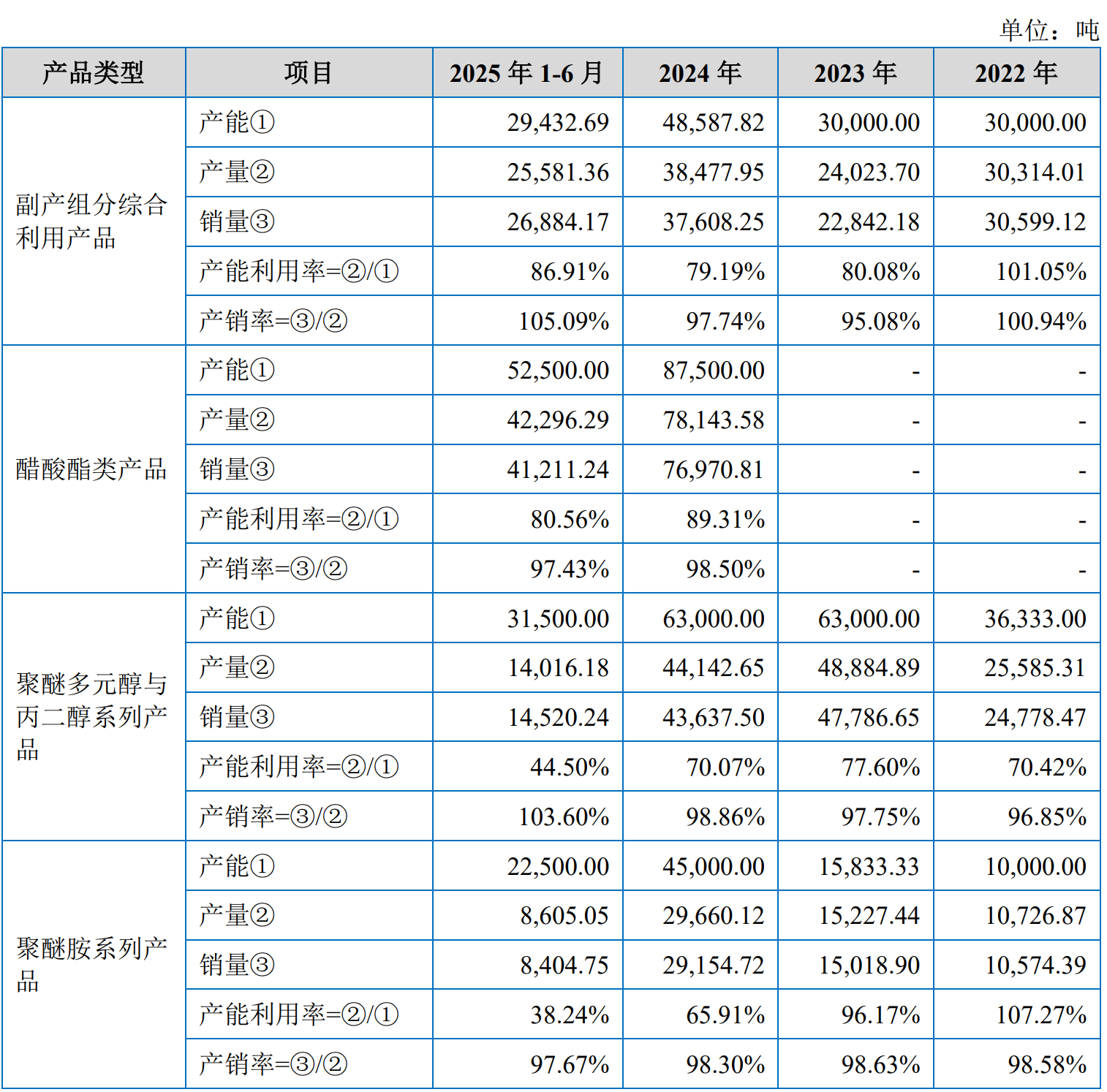 2024年昌德科技营收大增核心来自乙酸乙酯等低毛利产品放量,该业务成为营收增长主力,但盈利能力持续恶化。数据显示,乙酸乙酯毛利率2023年为2.74%。 2025年上半年为0.35%。另一核心产品聚醚胺同样不容乐观,受2022年以来市场价格持续走低影响毛利率仅剩1.09%。两大主营产品均处于“薄利甚至微利”状。