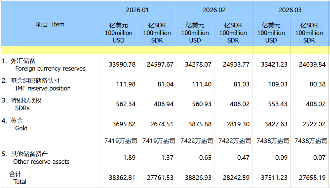 2026年3月,受全球宏观环境、主要经济体货币政策及预期等因素影响,美元指数上涨,全球主要金融资产价格下跌。汇率折算和资产价格变化等因素综合作用,当月外汇储备规模下降。我国经济运行总体平稳、稳中有进,高质量发展取得新成效,为外汇储备规模保持基本稳定提供支撑。