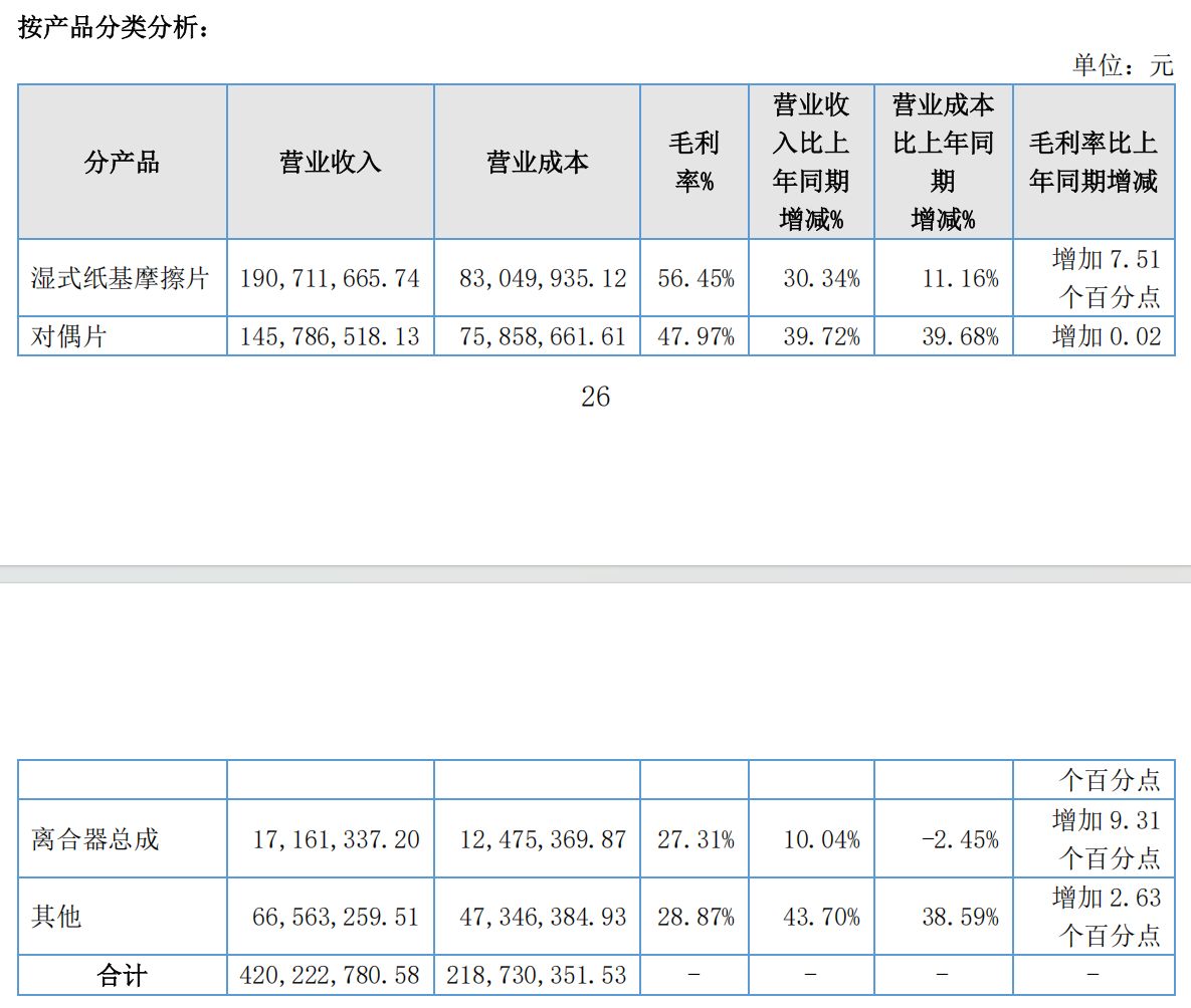对于业绩增长的原因,林泰新材在年报中表示,一方面,公司在传统能源汽车领域的产品销售收入稳定增长;另一方面,是插电式混合动力汽车渗透率的快速提升,带动了公司在混合动力专用变速器(DHT)领域的销售收入快速增长。“湿式纸基摩擦片”类产品依然是公司营收主力军,去年收入同比增长30.34%来到约1.91亿元,毛利率提升至56.45%。“对偶片”产品为公司收入中的第二大拼图,去年收入同比增长39.72%至约1.46亿元。