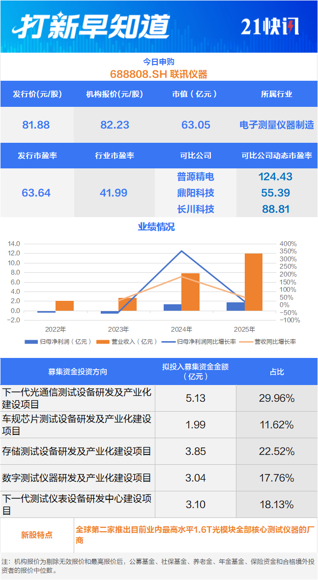4月14日,可申购科创板的联讯仪器(688808.SH)。该公司是国内领先的高端测试仪器设备企业,主营业务为电子测量仪器和半导体测试设备的研发、制造、销售及服务,专业为全球高速通信半导体等领域用户提供高速率、高精度、高效率的核心测试仪器设备。