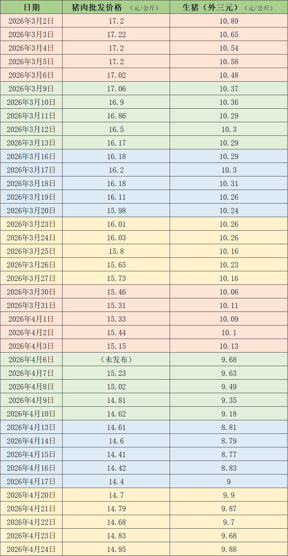 近期的猪肉和生猪价格。制表澎湃新闻