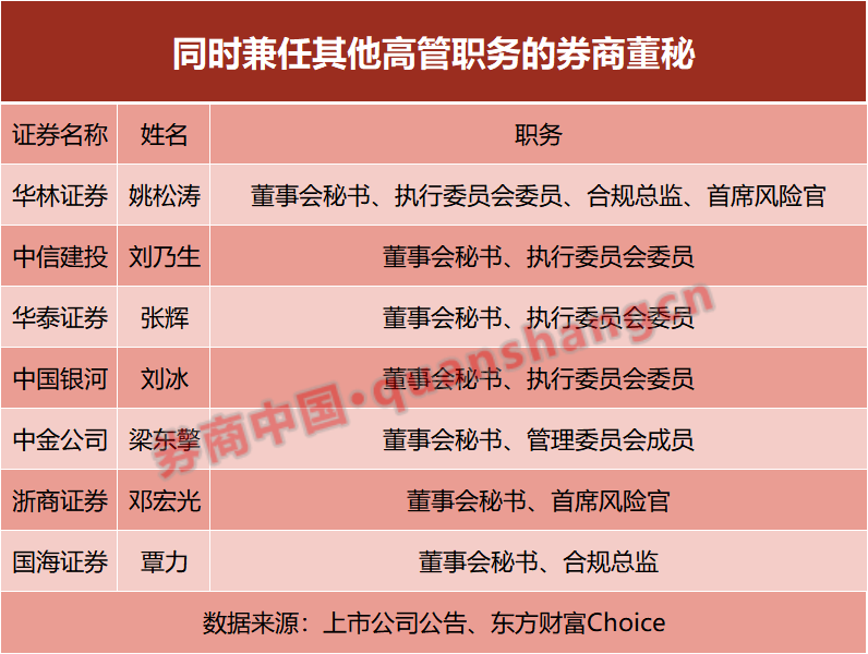 具体来看,华泰证券董秘张辉兼执行委员会委员;银河证券董秘刘冰兼任执行委员会委员;中信建投董秘刘乃生兼执行委员会委员;中金公司董秘梁东擎兼管理委员会成员;国元证券董秘李洲峰兼执行委员会委员;华林证券董秘姚松涛兼执委会委员、合规总监、首席风险官。