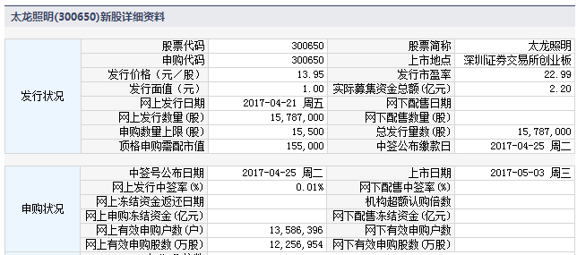 根据交易所公告,太龙(福建)商业照明股份有限公司于2017年5月3日起在深圳证券交易所创业板上市。