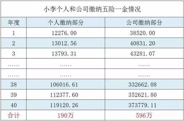 40年时间,小李个人缴纳190万元,所在XX公司缴纳596万元,合计786万元。