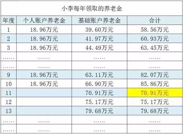 1、个人账户养老金:小李个人账户养老金有190万,分120个月(10年时间)发放,每个月发放1.58万元,相当于一年发放18.96万。