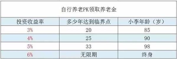 现在问题来了,小李在不同收益率下,自行养老和领取养老金在什么时间点会达到临界平衡点呢?