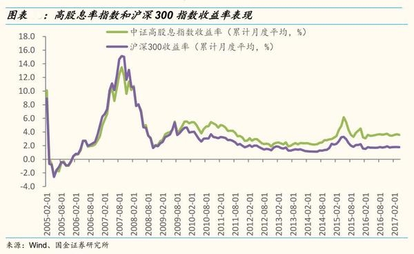 特别是2009年以来,高股息率指数表现一直优于沪深300指数。数据上看,截止目前(2017年4月底),高股息率指数累计月均收益率达3.6%,高出沪深300指数收益率1.8%。