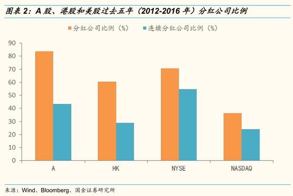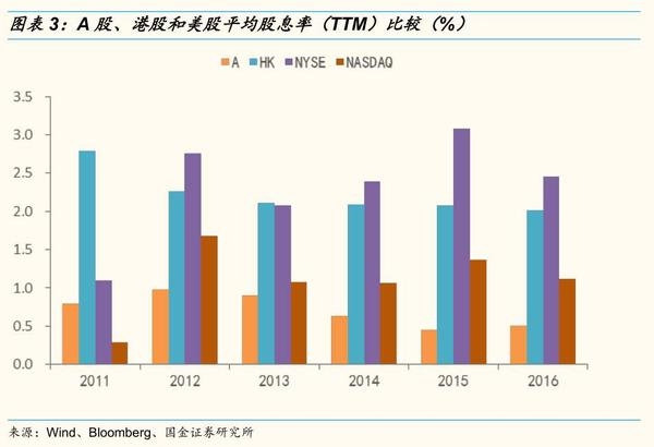 (1)A股现金分红公司比例较高:过去五年,A股上市公司中进行过现金分红的公司数量占比为83.6%,高于港股的60.4%和美股的51.3%。(2)A股股息率明显较低: 2016年A股股息率(TTM)为0.51%,明显低于港股的2.02%和美股的1.85%。(3)A股上市公司平均分红率较低:2016年A股平均分红率为35%,而同期港股和美股平均分红率分别为51.6%、82.0%。