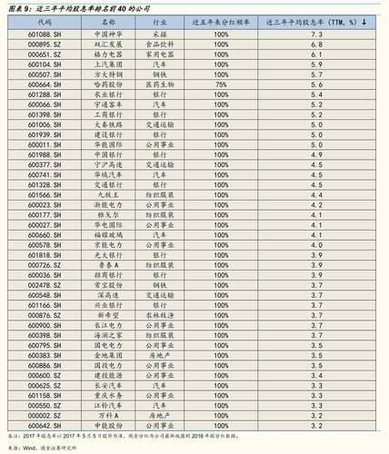 近三年来(2015-2017年)A股银行行业平均股息率达2.46%,非银金融(特别是保险股)为1.09%。第二阶梯,股息率较高的分别为交通运输(主要集中在铁路、公路、机场等)0.92%,公用事业(主要集中在电力)0.90%,家电0.84%,纺织服装0.77%,食品饮料0.76%,汽车0.71%,房地产0.70%,商业贸易0.70%。