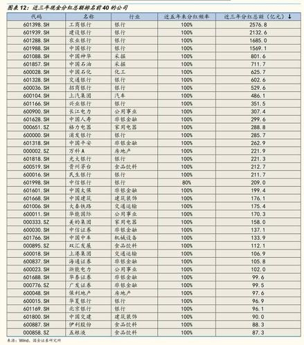1)历史上高分红(近三年平均股息率高)的个股,如:中国神华、双汇发展、格力电器、上汽集团、方大特钢、哈药股份、农业银行、宇通客车、工商银行、大秦铁路、建设银行、华能国际、中国银行、宁沪高速、华域汽车等;2)分红总额较大的(近三年累计分红总额),如:工商银行、建设银行、农业银行、中国银行、中国神华、中国石油、中国石化、交通银行、招商银行;3)目前分红频率低,但未来有潜力进行高分红的公司,如:鲁商置业、东方集团、恒源煤电、郑州煤电、远兴能源、阳泉煤业、亚泰集团等;4)上市以来从未进行现金分红的公司有38家(辩证的看),如:金杯汽车、ST山水、博信股份、祥龙电业、中核钛白、仰帆控股、园城黄金、*ST宝实、汉王科技等。