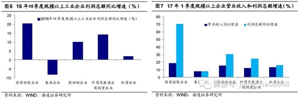 近期国企盈利增速远高于私企。根据统计局的数据,16年四季度,规模以上企业中,国企利润总额同比增速为20.4%,是各类型企业中最高的,其次是外企和股份制企业,私营企业利润增速仅为2.1%。2017年1季度,规模以上企业中,国企实现营业收入和利润总额同比增速分别为18.2%和70.5%,私营企业实现营业收入和利润总额同比增速仅有12.8%和15.9%,股份制企业也仅有15.2%和30.2%,均远低于国有企业。