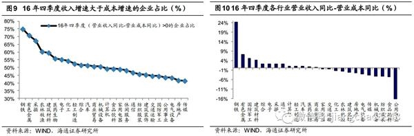 具体到微观企业层面,我们统计了16年四季度不同行业中营业收入增速高于成本增速的上市公司家数占比,钢铁、有色、采掘行业排前三,有75%的钢铁上市公司营业收入增速高于营业成本增速,有67%的采掘行业上市公司营业收入增速高于营业成本增速,71%的有色金属上市公司营业收入增速高于成本增速。