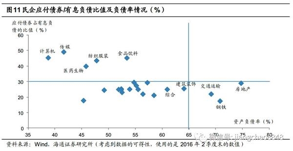 计算机、传媒、纺织服装、医药生物、食品饮料行业的民营企业普遍具有高债券融资比例的特点,这些行业的平均资产负债率均在55%以下,应付债券占有息负债的平均比值在40%以上,虽然杠杆率普遍不高,但对债券融资的依赖较高,债券利率的上行将显著增加其融资成本。