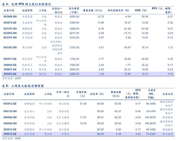 一级市场方面,上周共有10家公司完成IPO网上发行,募集资金共62.00亿元;本周共10家公司完成IPO网上发行,预计募集资金共57.70亿元,较上周下滑6.94%。上周共4家公司公布定增预案,预计募集资金共162.35亿元,较上上周同比下滑81.95%。