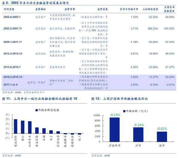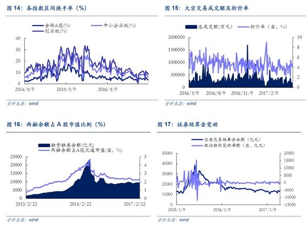 市场情绪解读:上周A股市场情绪继续回落,国际避险情绪退潮。国内市场方面,上周A股市场受金融监管力度进一步提升(继针对银行委外和保险产品后,证监会严查券商资金池业务),投资者情绪偏谨慎,申万大盘股股票表现占优。同时,市场高风险博弈持续受到打压,次新股指数大跌4.05%。此外,上周新疆板块崛起,带动相关概念走强,叠加本周一带一路峰会召开,有望提振局部市场情绪。值得注意的是从历次金融监管周期来看,我们以区间日均换手率为市场情绪的衡量指标,发现金融监管对于市场情绪的影响需要结合监管的力度和内容。在2008-2011年的金融监管周期中,换手率仍然居高不下;但自前年股灾之后随着金融行业真刀实枪地进行全面去杠杆,市场情绪同步回落至历史低位。国际市场方面,近期原油价格暴跌叠加大宗市场表现不佳,施压香港能源股,叠加近期A股走弱,上周恒生指数收跌。同时,上周发布的非农就业数据靓丽加大美联储加息概率,法国大选局势落定,三大市场恐慌指数均有下滑,国际避险情绪开始退潮。