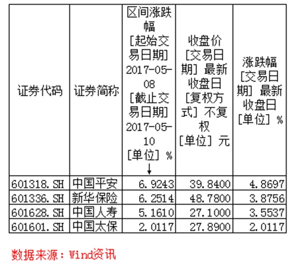 5月10日,上证综指报收于3052.79点,跌0.90%,再创1月16日以来新低。在盘面一片碧绿中保险板块逆势翻红,四家A股上市险企中国人寿(601628.SH)、中国平安(601318.SH)、中国太保(601601.SH)、新华保险(601336.SH)当日分别上涨3.55%、4.87%、2.01%、3.88%。其中,中国平安股价创下2015年7月以来的新高,新华保险放出十四连阳。