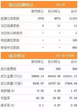 昨日新增挂牌企业11家,挂牌企业总数达到11153家,做市转让1579家,协议转让9574家,待挂牌总家数195只,申报中总家数达到860家。