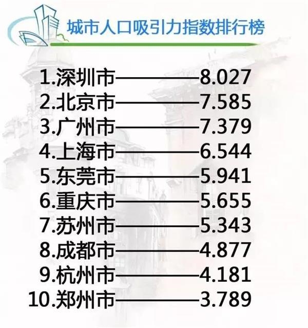 人口吸引力排名前十的城市中,长三角、珠三角各占三个,人口吸引力突出。主要城市人口吸引力指数排行:
