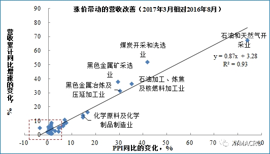 注:本轮涨价且营收大幅增长的行业主要是供给侧改革中收益的上中游资源和原材料行业,多数行业涨价不多,营收增速也较低。