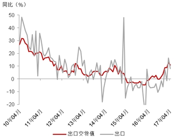 4月份,以美元计价的出口增速由上月的16.4%回落至8%,反映在当月的出口交货值上,工业企业实现出口交货值同比名义增长10.8%,亦较上月回落2.1个百分点。从历史数据来看,制造业投资和出口增速表现出比较明显的相关性。另外,去年下半年以来的主动加库存近尾声也使得需求预期阶段有所转弱。