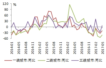 图20:30个大中城市地产销售降幅收窄,三线正增长