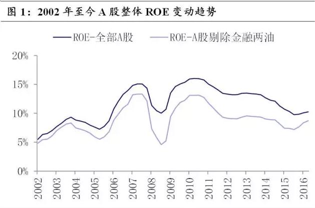 再看下面这张图,是2002年以来A股整体的ROE变化趋势,是不是和上证指数的走势非常相似。是的,2010年以来A股整体的ROE水平在不断走低,现在市场的ROE水平就是和十年前3000点时的水平大致相当。在整体利率中枢没有明显下降的情况下,股票价格很难出现大幅上涨。(2007年3月沪指3100点,十年期国债收益率3.4%;2017年5月沪指3100点,十年期国债收益率3.6%。)
