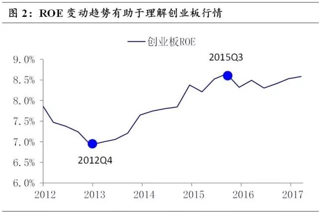 下面这张图或许能够帮助我们更好地理解创业板行情和风格切换。创业板的牛市始于2012年12月、终于2015年6月。促成创业板牛市的因素有很多,包括科技创新、移动互联网等等。但至少从财务数据看,我们可以清晰地发现,从2012年四季度开始创业板公司的整体ROE水平开始见底回升,这个ROE回升的过程一直持续到2015年三季度,正好对应的是创业板牛市结束的时间。而从2015年三季度到现在,虽然创业板公司仍然继续保持着近40%的净利润增速,但ROE增长已经没有了。外延式并购重组带来净利润增加的同时,带来了更高的股本增速,但企业投资的资金运用效率并没有提高,这是制约当前创业板公司股价的重要因素。