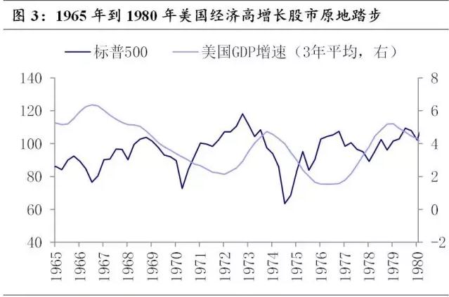 GDP长期高速增长而股市不涨绝非中国独有,当年的美国亦是如此!从1965年到1980年,美国GDP年均增速高达3.8%大大高于80年代以后平均2.7%的增长水平。但就在这样的经济高速增长时期,美国股市基本一点没涨,标普500指数始终横在100点左右(见下图),这与咱们上证指数十年还在3000点是何其的相似。为什么会这样?究其原因,就是美国六七十年代也是靠投资靠财政政策靠货币政策刺激经济,使得市场利率很高但企业的净资产收益率却无法提高。